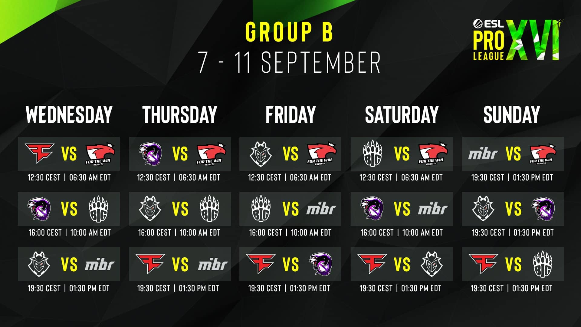 Este miércoles 7 de septiembre comienza el igualado Grupo B de ESL Pro League 16. FaZe, G2, BIG, Outsiders, MIBR y FTW forman este segundo cuadro que se disputará del 7 al domingo 11 de septiembre. El equipo portugués debutará en la mayor liga del CS:GO tras haberse clasificado con una gesta histórica digna del «From Zero to Hero». Como en todos los grupos, los tres primeros pasarán a la ansiada fase de playoffs.