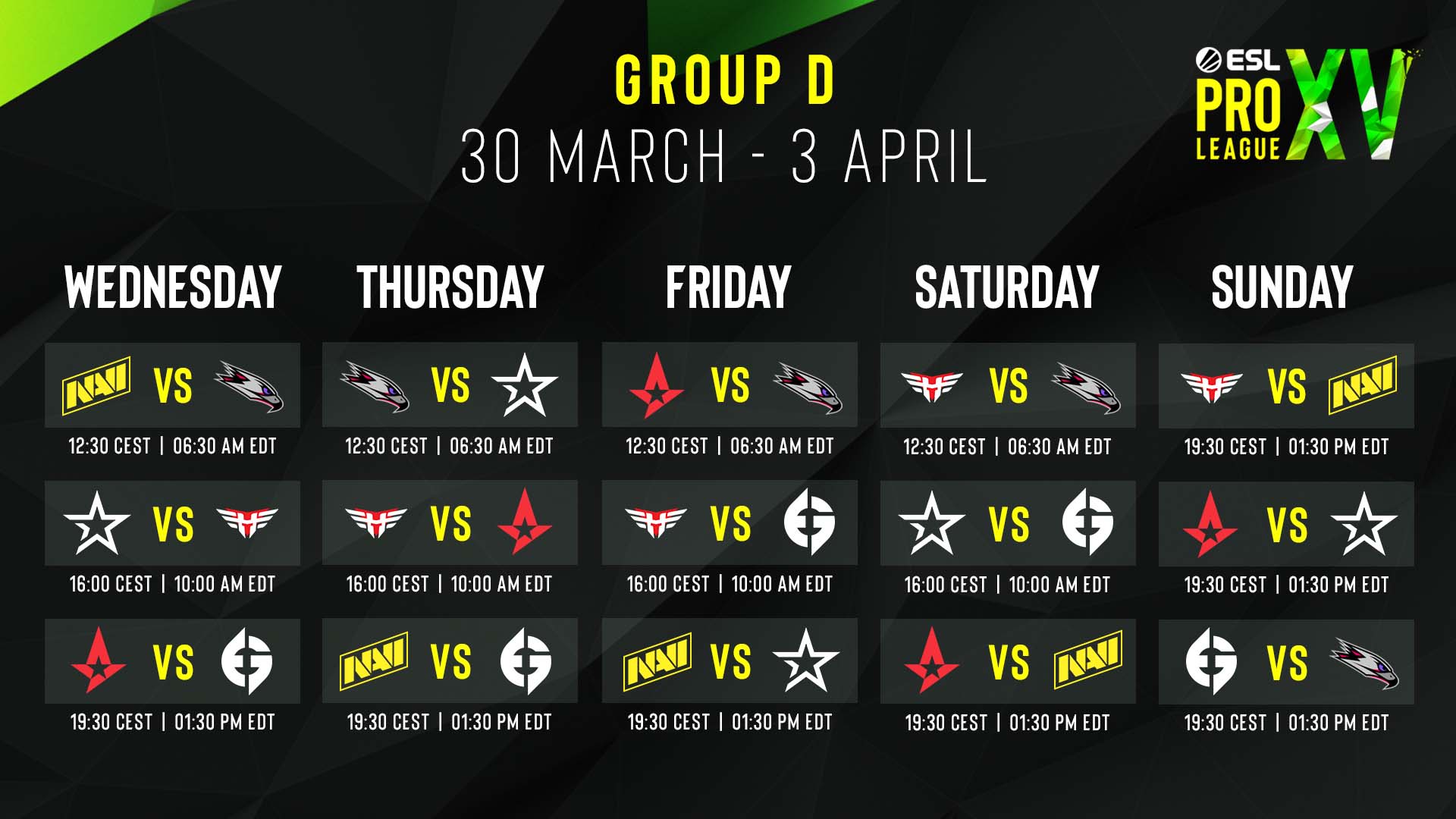 Este miércoles 30 de marzo comienza el Grupo D de la Temporada 15 de ESL Pro League. Tras casi un mes del mejor CS:GO internacional y diferentes sorpresas, la fase de grupos de este evento llega a su fin. NIP, FURIA y Movistar Riders ya esperan en Cuartos de Final tras liderar sus respectivos grupos. Por otra parte, Entropiq, fnatic, ENCE, FaZe, Players y Team Liquid tendrán que jugar una ronda previa para estar en la siguiente ronda. A estos nueve equipos habrá que sumarles los tres clasificados de un Grupo D complicado de pronosticar.