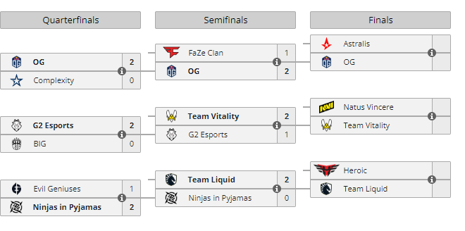 La segunda ronda del clasificatoria dejó grandes sorpresas y enfrentamientos. OG derrotó a FaZe por 2-1 mostrando que los últimos cambios han mejorado considerablemente al roster liderado por nexa. Team Liquid también sorprendió a todos tras derrotar por 2-0 a Ninjas in Pyjamas en un partido muy ajustado. Un buen oSee en el primer mapa y las actuaciones estelares de ELiGE y YEKINDAR en el segundo dictaminaron la victoria. Los ninjas siguen sin destacar en los grandes partidos mientras que Team Liquid da la cara por la escena de NA. Vitality venció a G2 2-1 en tres mapas muy poco igualadas y con un HooXi protagonista tras un -29.