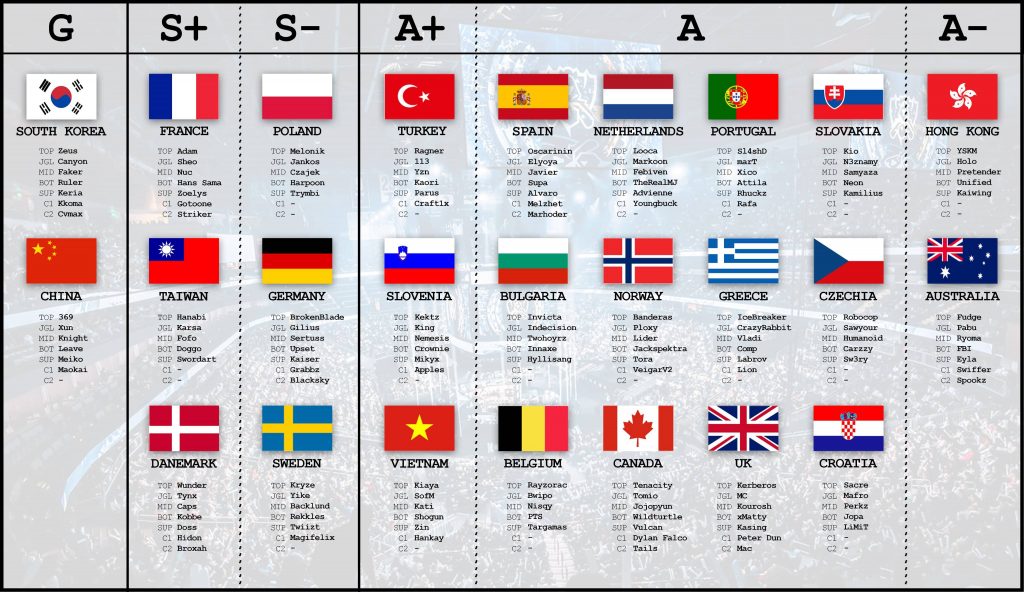 Empezando por casa, Cook considera que el quinteto titular de España sería Oscarinin, Elyoya, Javier, Supa y Alvaro. Esta alineación estaría liderada por Melzhet y Marhoder y será uno de los equipos más fuertes según el propio francés. Por encima de estas aparecen las habituales. Cook considera que Corea del Sur y China serían las favoritas para conquistar este campeonato. Jugadores de la talla de Zeus, Faker, Ruler, 369, Knight o Xun aparecen en estas dos plantillas que asustan. Un escalón por debajo estarían Francia, Dinamarca y Taiwán. Por encima de España, que ocupa el escalón del Nivel A, aparecerían equipos como Polonia, Alemania, Suecia, pero también Turquía, Eslovenia y Vietnam. ¿Estáis de acuerdo con el escalón que ocupa España?
