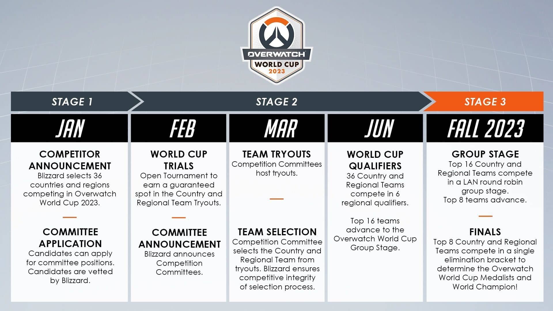 En febrero será turno del World Cup Trials, un torneo abierto para que los jugadores compitan por un hueco directamente para representar a su país. No obstante, otros tantos jugadores podrán inscribirse para las pruebas que comenzarán en marzo, pruebas que tiene como requisito un rango competitivo de Diamante o superior. El evento volverá a ser protagonista en junio con las eliminatorias a través de una competición regional. De los 36 primeros participantes tan solo 16 estarán en la siguiente fase que se disputará en LAN en otoño de 2023. En esta fase ya se conocerá al campeón de la Copa del Mundo de Overwatch.
