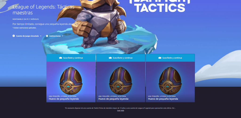 Podéis canjear vuestro huevo de leyenda aleatoria desde este enlace en caso de que seáis suscriptores del servicio prime de Amazon. En caso contrario y si estáis interesados, el servicio cuesta 3,99 de forma mensual. La forma de canjearlo es bastante sencilla, solo es necesario vincular las cuentas de Riot Games con la de Twitch y pulsar en el botón de «reclamar contenido.»