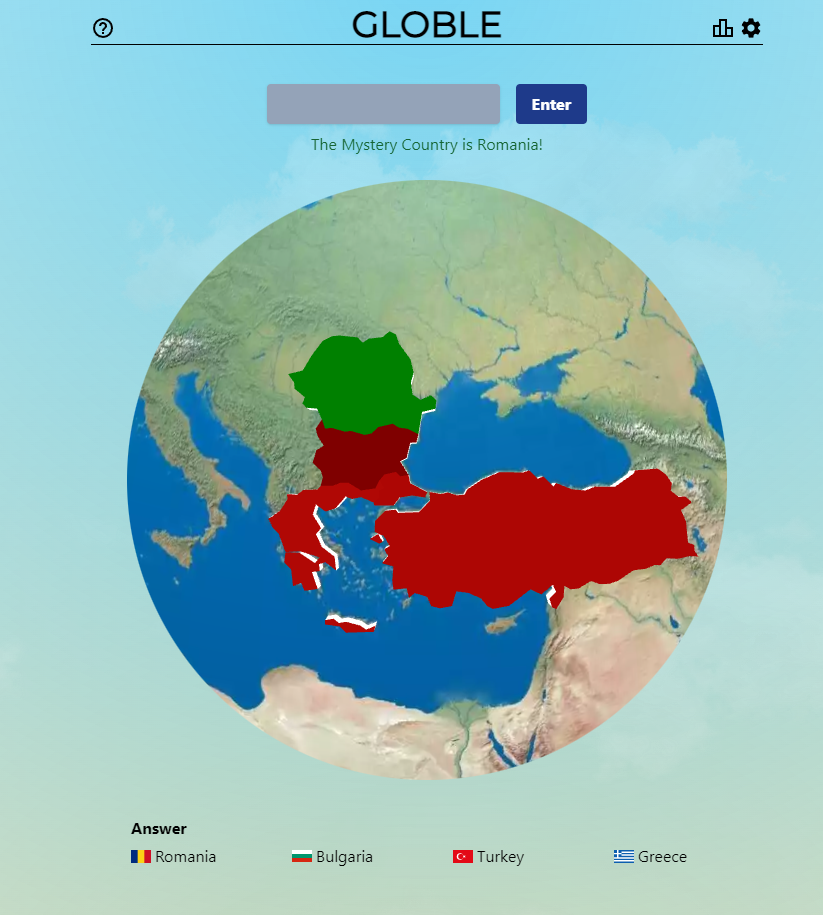El objetivo de Globle es averiguar el país en el menor número de intentos posibles. Dependiendo del que escojamos, aparecerá un color u otro, indicándonos lo cerca o lejos que estamos de nuestro objetivo. Por ejemplo, en el intento que hemos probado, escogimos Bulgaria para empezar, y este comenzó con un rojo oscuro que nos indicaba lo cerca que estábamos de nuestro objetivo. Tuvimos suerte de inicio, mucha, pero ni mucho menos habíamos llegado al objetivo. ¿Turquía? Rojo claro, cerca pero no, ¿Grecia? Lo mismo. Tocaba pensar pues en otro país fronterizo, el escogido fue Rumanía, que era la opción correcta, habíamos acertado.