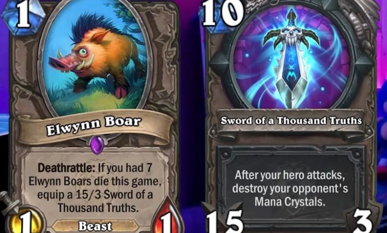 Ahora, casi 15 años después de aquel suceso, el equipo de desarrollo de Hearthstone ha decidido rendir homenaje a ese momento con unas cartas en su honor. La carta, llamada «Elwynn Boar«, es una bestia que debe ser asesinada una y otra vez (al igual que los protagonistas hacen con los jabalíes en el capítulo para subir de nivel) antes de poder equiparse un arma definitiva.